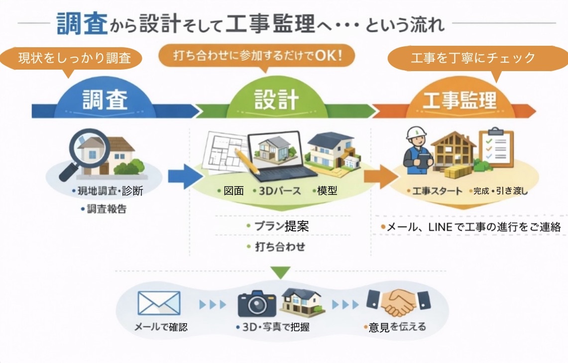 わかりにくい建築物の現状、どうしたらよいか迷う方向性、煩雑な補助金や行政への手続き・・・これらを調査・企画・設計・申請そして工事までのプロセスをスムーズに行うことでこれからの時代の新たな「建築の再生」を支援させていただきます。